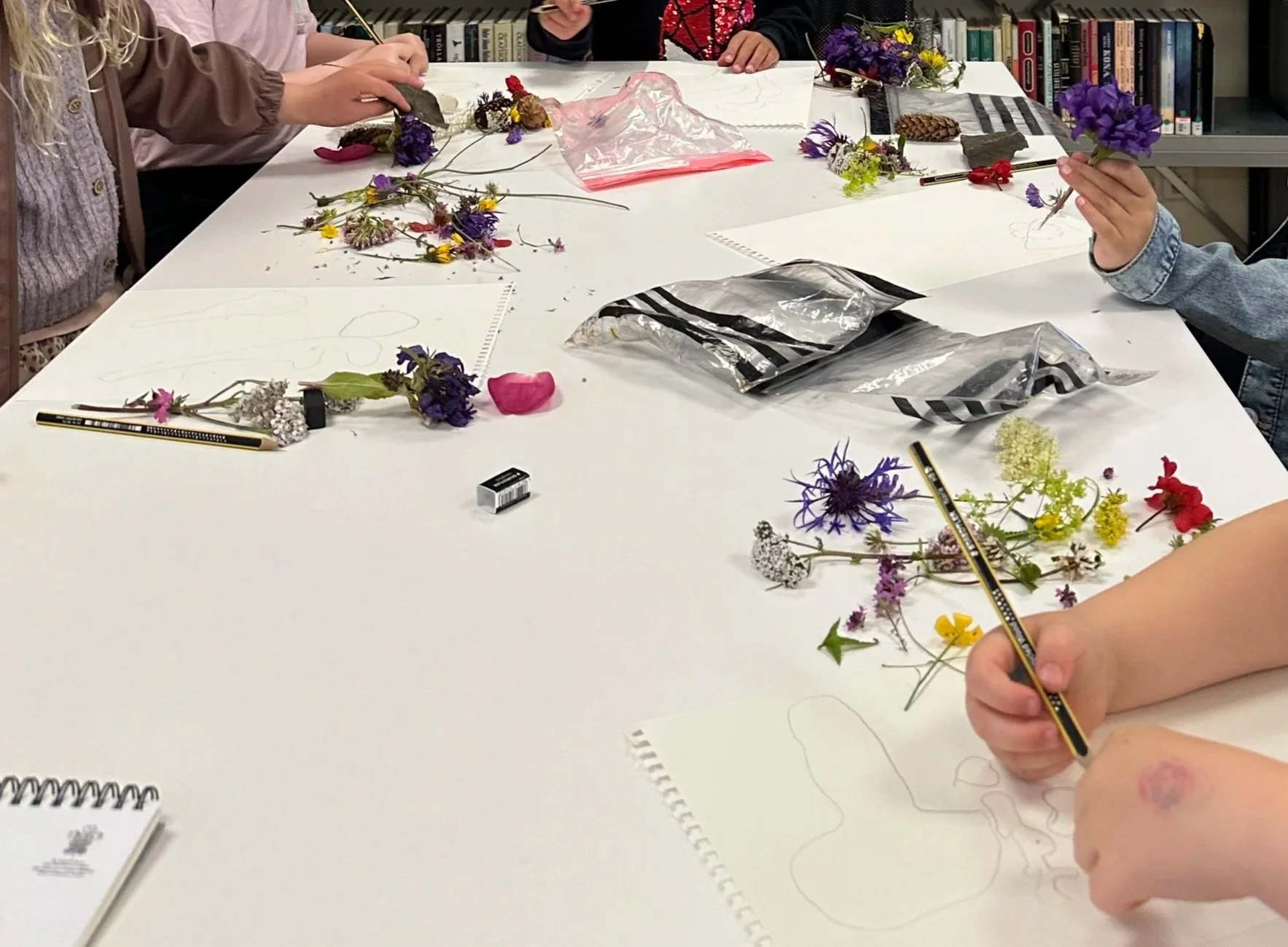 Námskeiðið er frá klukkan 9 - 13, mánudag til föstudags. Hvern dag er nýtt viðfangsefni eða þema sem við vinnum út frá. Börnin fá að geyma listaverkin sín í möppu sem er merkt þeim og Þórunn heldur utan um. Í lok námskeiðs fá þau svo að taka með sér heim bók, sem inniheldur öll listaverk vikunnar, auk tómra blaðsíðna í lokin til að bæta við fleirum. Hádegismatur er kl. 11:30. Þegar börnin hafa lokið við að borða, fá þau að leika sér með krítar, sippubönd og sápukúlur sem eru í boði. Þá förum við aftur inn og klárum daginn þar. Í vikunni er farið í tvær stuttar vettvangsferðir, göngutúr að tína blóm og heimsókn á Hönnunarsafn Íslands. Foreldrar fá svo sendar myndir af barninu sínu í tölvupósti, þegar námskeiðinu er lokið.